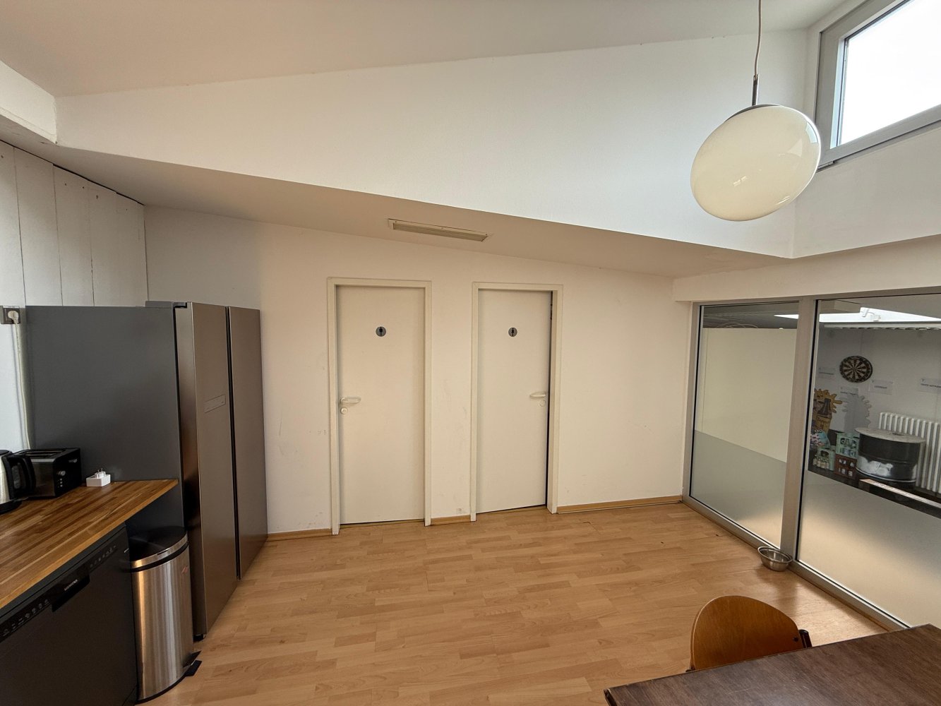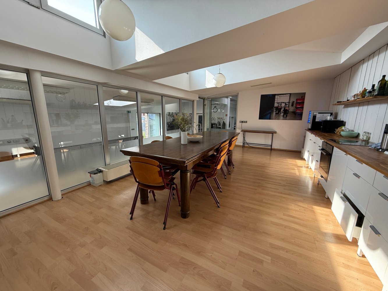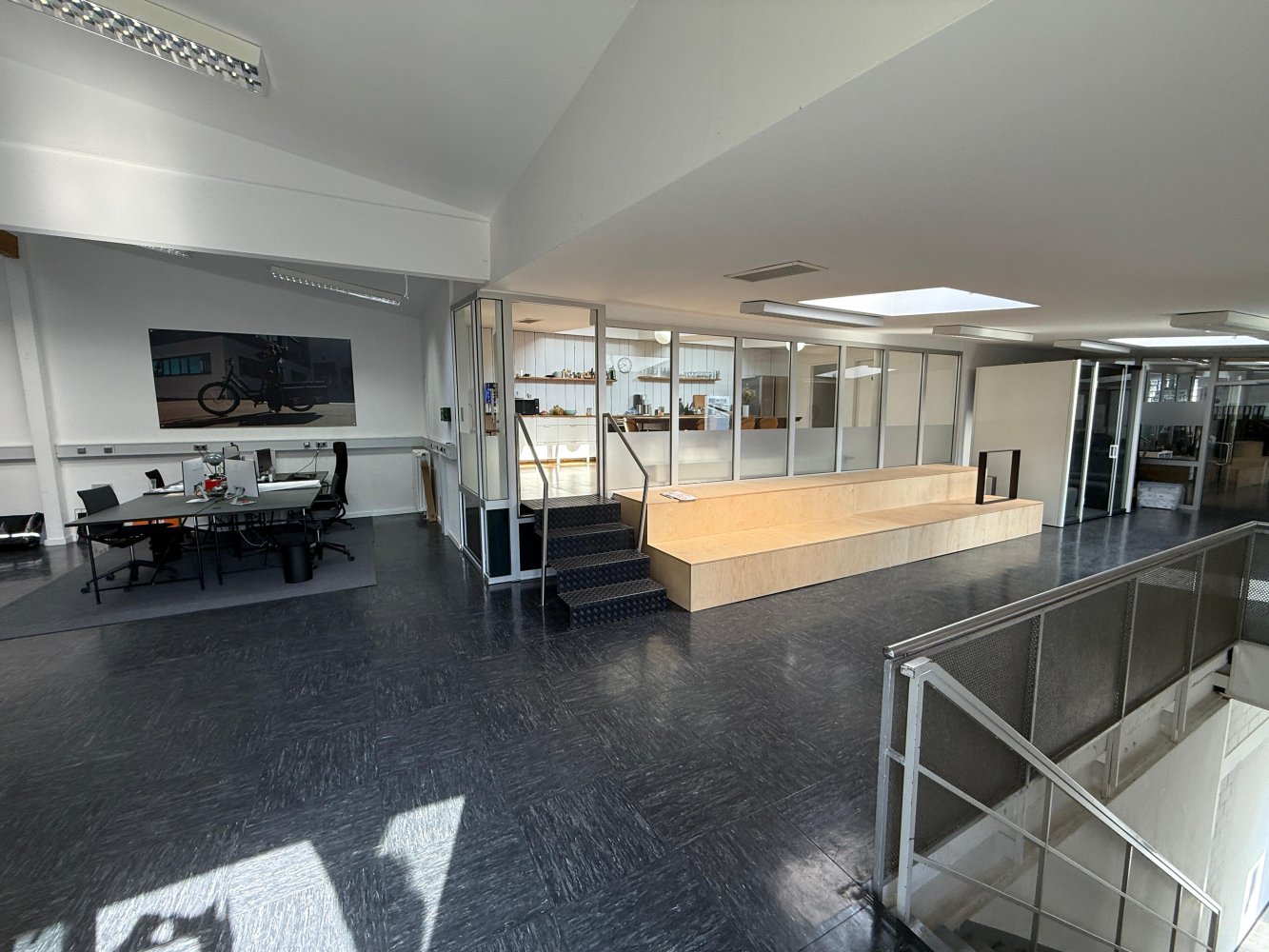 Die Kombination aus industrieller Substanz, flexibler Nutzbarkeit und großzügigem Gemeinschaftsbereich macht diese Fläche ideal für moderne Arbeitsformen, kreative Teams und Unternehmen, die Wert auf Austausch und Wohlfühlklima legen.