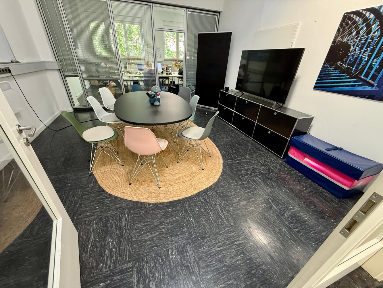 Ein besonderes Highlight ist der offen gestaltete, großzügige Küchenbereich, der direkt an den OpenSpace angrenzt. Dieser lädt Teams dazu ein, die Mittagspause gemeinsam zu verbringen oder in lockerer Atmosphäre zusammen zu kochen. Die großen Fenster mit Blick in den ruhigen Innenhof und den begrünten Garten sorgen für eine angenehme Arbeitsatmosphäre mit viel Tageslicht.