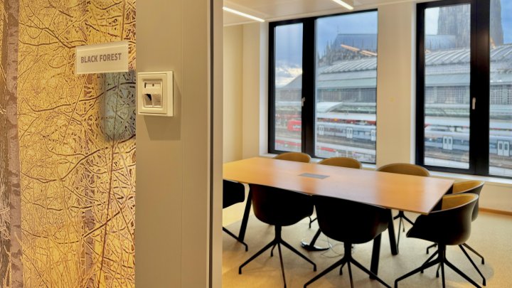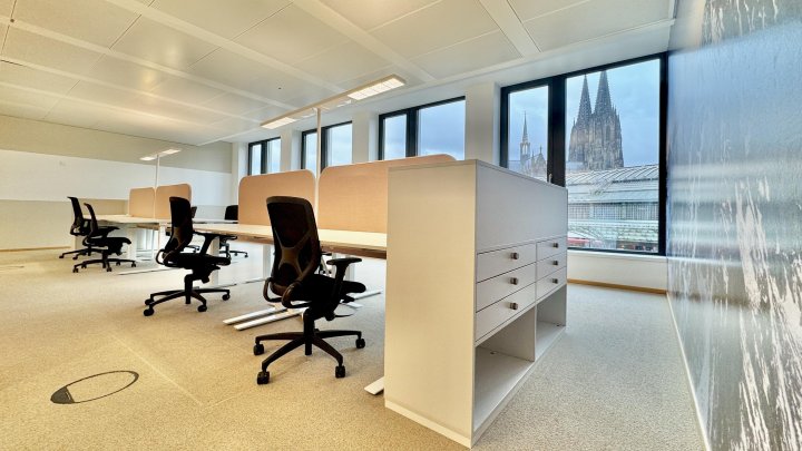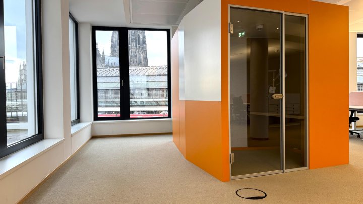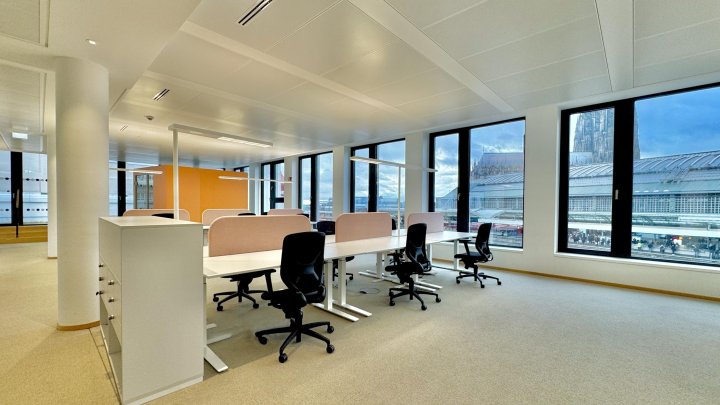 Das moderne Ambiente unterstreicht eine innovative Arbeitsatmosphäre und bietet zugleich einen der schönsten Ausblicke von ganz Köln.